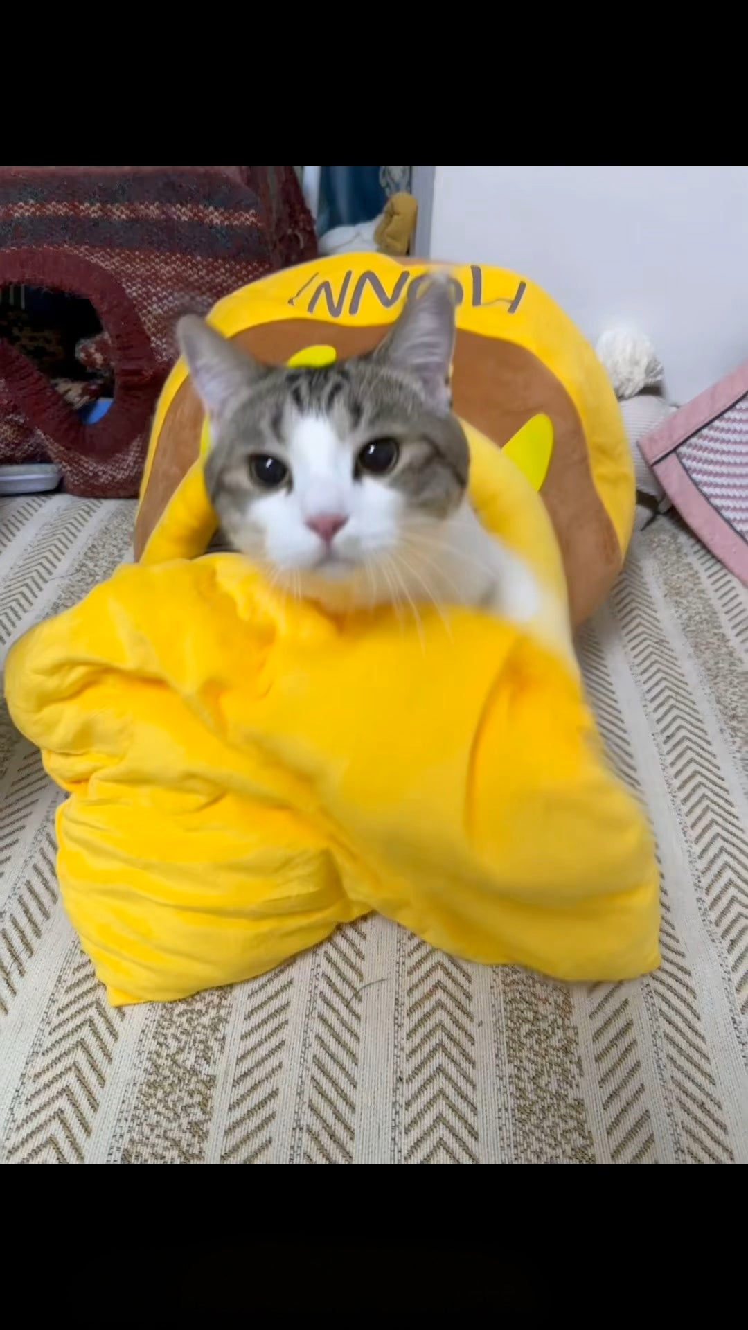 Say goodbye to cold, hard floors and welcome your beloved cat into a warm, private, and secure sweet retreat! Designed like an adorable honey jar, this bed features thick, high-resilience sponge filling and surrounding plush high borders that effectively block drafts and lock in your pet's body heat. It's the perfect spot for lazy naps and quiet moments alone.