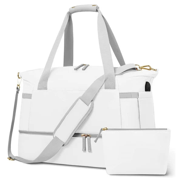 Dry Wet Separate Duffel BagΒ This duffle bag for women delivers roomy main compartment to store your clothes and items. A zippered waterproof PVC lined pocket for wet clothes or towels and swimsuits. In addition, this travel duffel bag also gives an extra small makeup bag for easy storage.